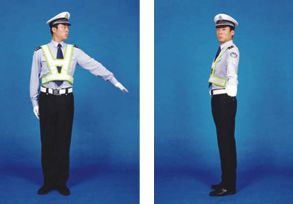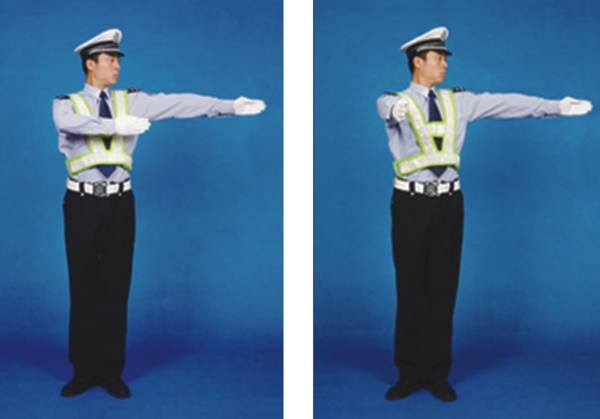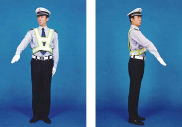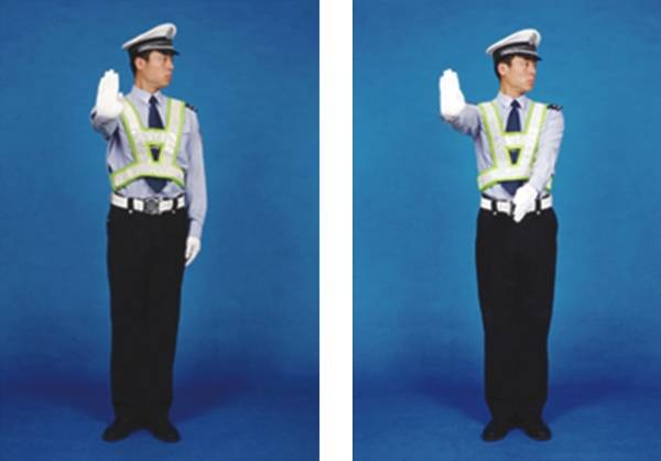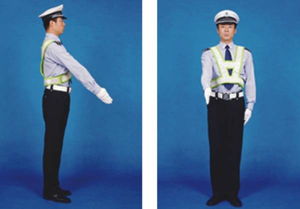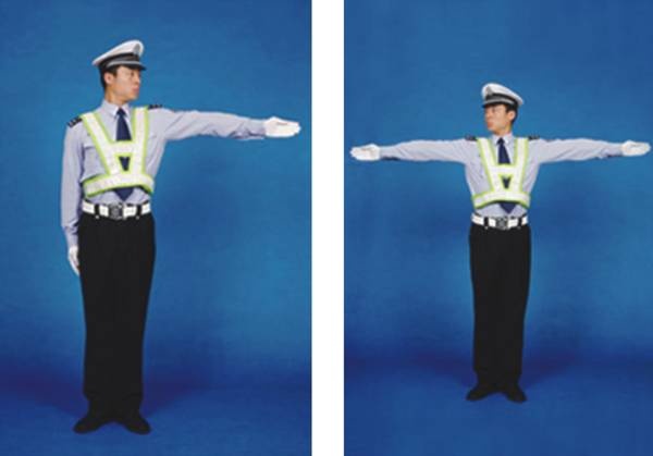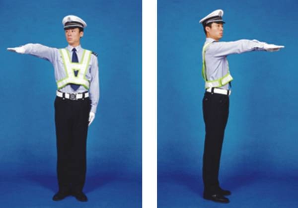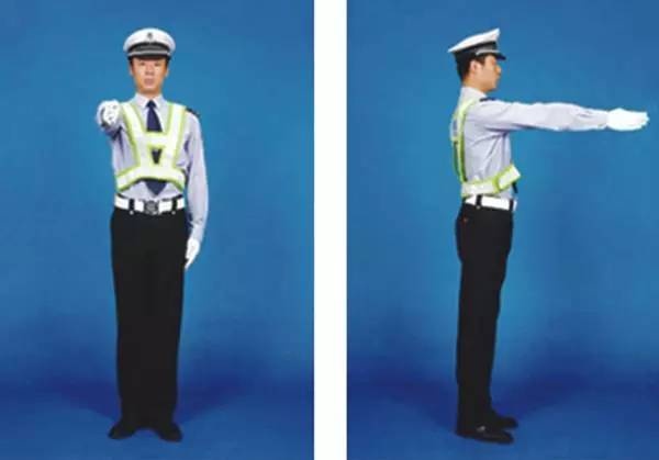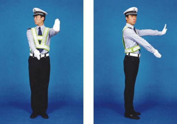 民警面向来车,左臂由前向上直伸,掌心向前,不准前方车辆通行。