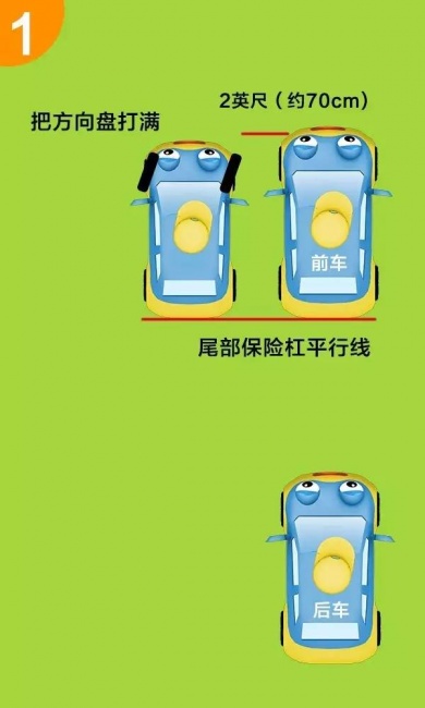 第一步:把车尽量从左边靠近停车位,与前车横向保持约70厘米的距离,尾部保险杠与前车的保险杠保持平行,开始倒车前打满方向盘。