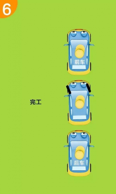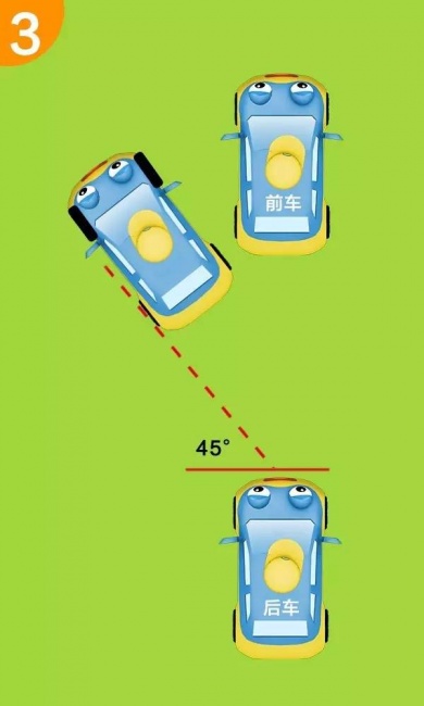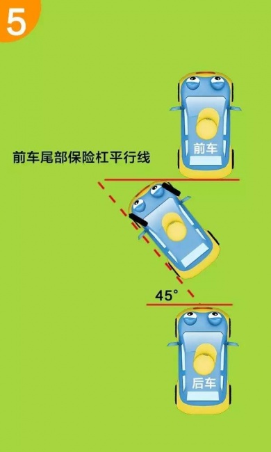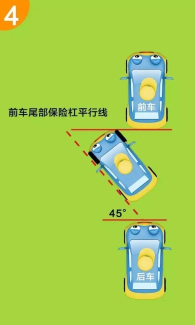 第四步:当你的车头刚好越过前面车辆的保险杠的时候,停止倒车。