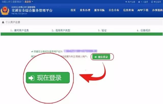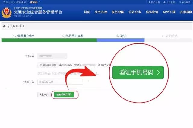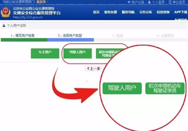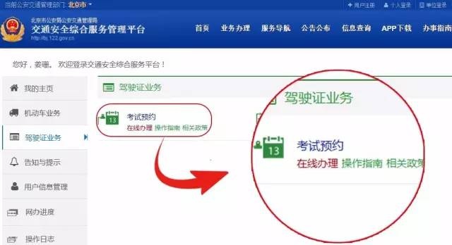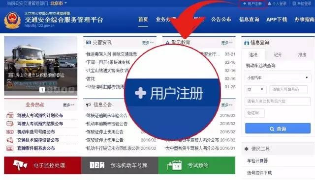 1、电脑登录北京市交通安全综合服务管理平台,网址:http://bj.122.gov.cn 点击位于页面右上方的用户注册(收到档案受理成功短信后,在互联网申请的学员用户,申请成功后具备考试预约功能)。