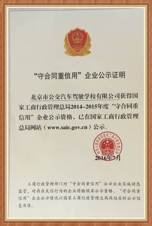 为推进企业诚信建设,规范企业合同行为,引导企业诚信履约、守法经营,国家工商总局向社会公示了2014-2015年度“守合同重信用”企业,北京公交驾校以良好的企业信誉和社会口碑,名列其中。