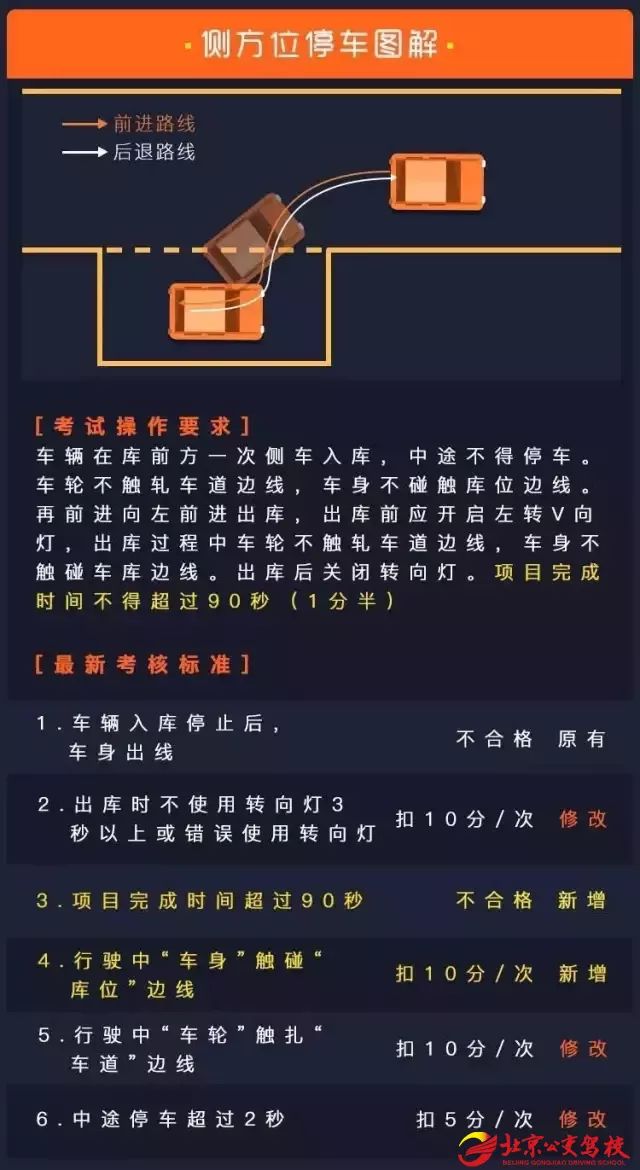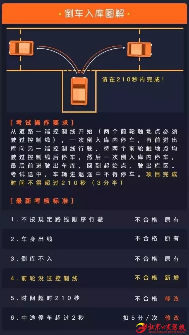 倒车入库从以前的不限时改为限时210秒内要完成,其实3.5分钟停好车位+出车位,时间绰绰有余,无须耿耿于怀那210秒。而且倒车入库时“中途停车”从不合格改为了每次扣5分。要求每次经过控制线,你以为是增加难度,其实是让你倒车入库时找到更合适位置的最好提示。改变实则较旧规更加人性化更加简单。