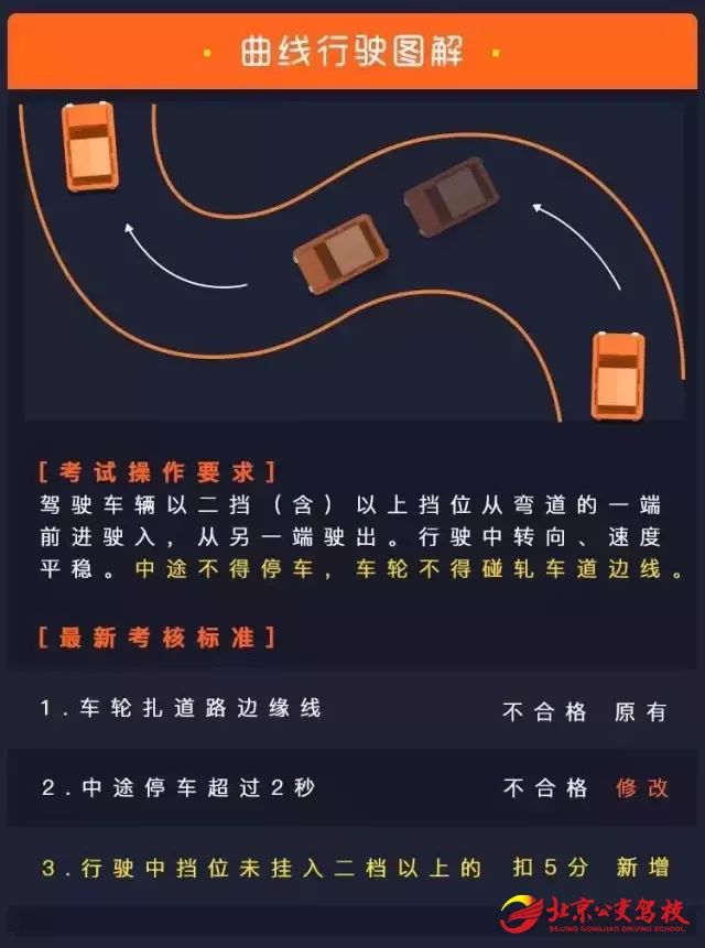 曲线行驶最大的变化在于需要挂二档通过,手动挡车适时换二挡,只要换挡时间准确,速度一样可以平稳;自动挡车没什么要求,还和以前一样。新规更贴合实际开车,但此项要求只扣5分,对考试结果影响不大,学员不用过于担心。