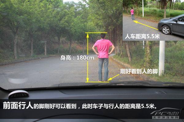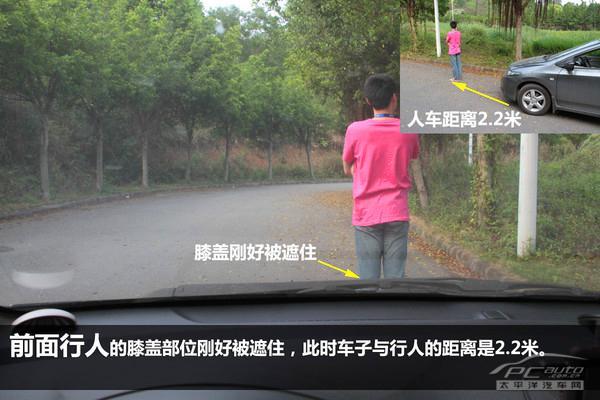 前面行人的膝盖部位刚好被遮住,此时车子与行人的距离是2.2米。
