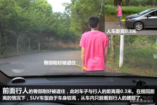 前面行人的臀部刚好被遮住,此时车子与行人的距离是0.3米。在相同距离的情况下,SUV车型由于车身较高,从车内只能看到行人的腰部了。为避免与行人发生擦碰,此时我们应该停车,让行人远离后再继续行驶。