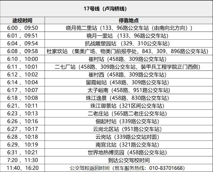 2024年4月11日起,公交驾校17路(卢沟桥线)中午来校班车时间提前10分钟,详细站点时刻表请见下方图示。同时,中午所有返回班车发车时间由原11:50调整为11:40,为您带来的不便请您谅解。
